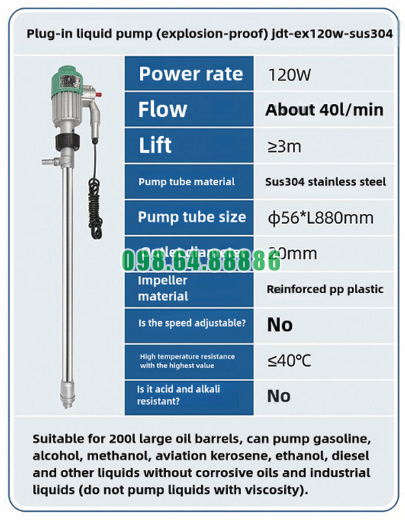Mẹo dùng Bơm chất lỏng cắm điện chống cháy nổ JDT-EX120W-SUS304 bơm nhanh hơn sẽ giúp bạn tối ưu hiệu suất làm việc, rút ngắn thời gian sang chiết và nâng cao hiệu quả vận hành. Dù bơm có lưu lượng khoảng 40 lít/phút, nhưng nếu sử dụng đúng cách, bạn hoàn toàn có thể đạt tốc độ bơm tối ưu trong thực tế.