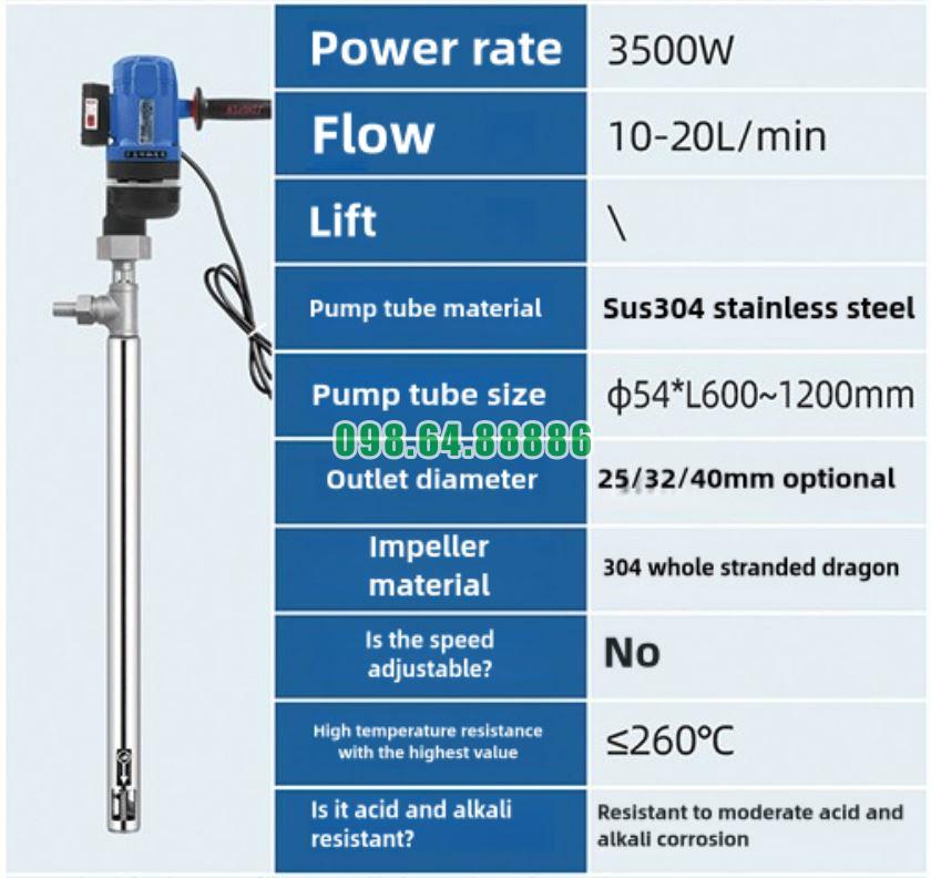 Bơm điện cầm tay dạng trục đứng JDT-3500W-JLG260 được chế tạo từ thép không gỉ, giúp chống lại tác động của hóa chất, dung môi và môi trường ẩm ướt.