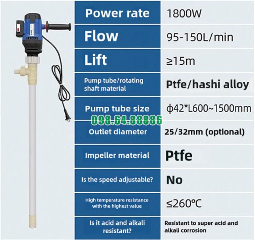 Bơm điện thùng phuy 200L JDT-1800W-PTFE đáp ứng mọi tiêu chuẩn khắt khe nhất