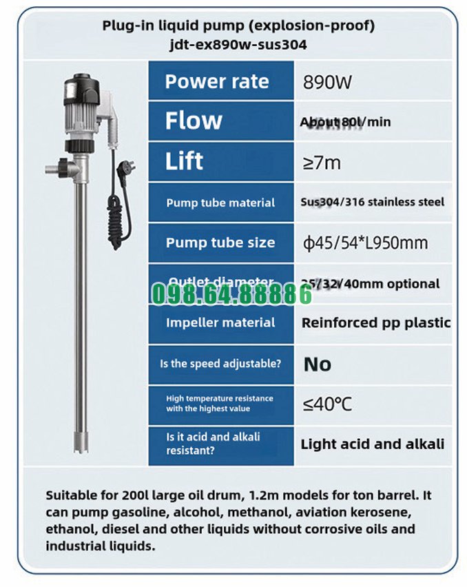 Nhờ vật liệu inox 304, Máy bơm chất lỏng cắm trực tiếp chống cháy nổ JDT-EX890W-SUS304 có thể xử lý các dung dịch như cồn, dung môi, axit và kiềm nhẹ.