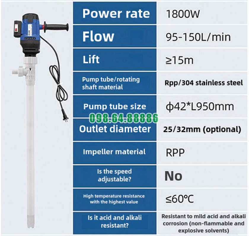 Với độ bền cao và khả năng hoạt động ổn định trong nhiều môi trường khác nhau, Máy bơm chất lỏng điện cắm điện JDT-1800W-RPP là lựa chọn phù hợp cho các doanh nghiệp cần thiết bị bơm chất lỏng hiệu quả và lâu dài trong môi trường công nghiệp.