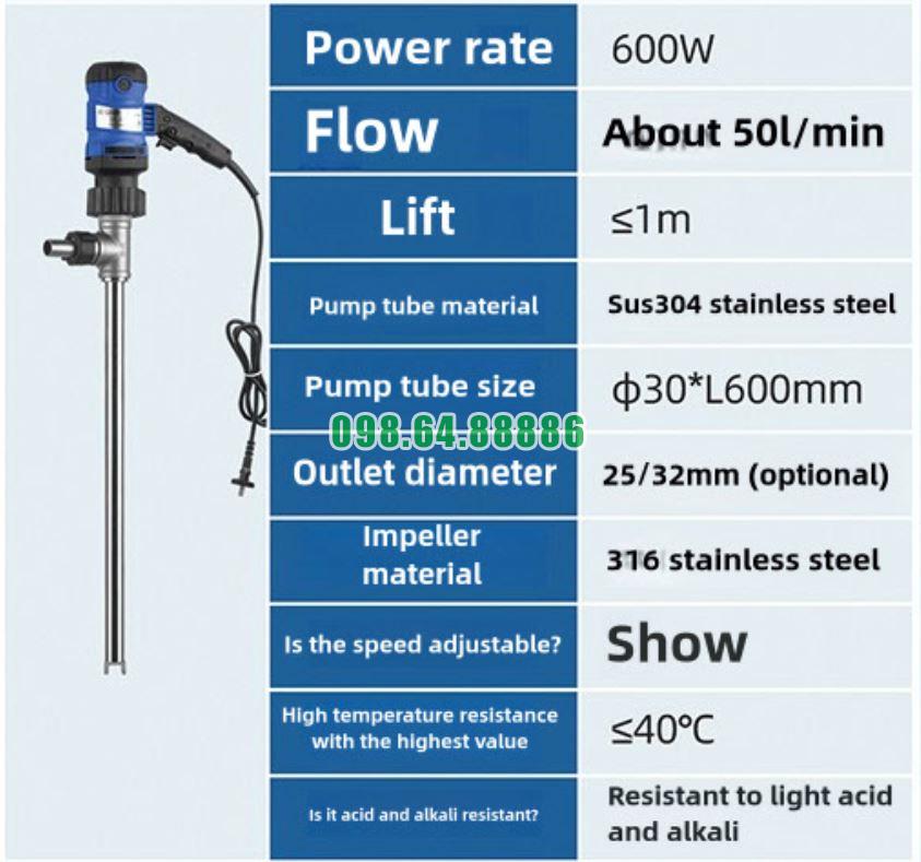 Động cơ 600W của bơm thùng phuy inox SUS304 JDT-600W yêu cầu nguồn điện ổn định (thường là 220V/50Hz).