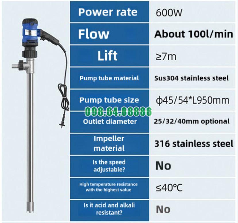 Bơm thùng phuy điện JDT-600W-304SUS là lựa chọn tối ưu cho dung môi và hóa chất nhờ khả năng chống ăn mòn tốt, an toàn cao, hiệu suất bơm mạnh và ứng dụng đa dạng. Thiết bị giúp doanh nghiệp tiết kiệm chi phí, nâng cao năng suất và đảm bảo vận hành ổn định trong môi trường công nghiệp khắt khe.