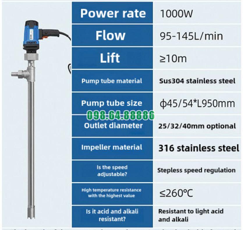 Với động cơ truyền động trực tiếp, thiết kế cân bằng và khả năng tản nhiệt tối ưu, Máy bơm thùng phuy inox SUS304/316 JDT-1000W-G260 nổi bật với độ ồn thấp, vận hành êm và tiết kiệm năng lượng vượt trội, là lựa chọn lý tưởng cho các ứng dụng chiết rót, bơm hút hóa chất hoặc dung môi trong môi trường công nghiệp hiện đại.